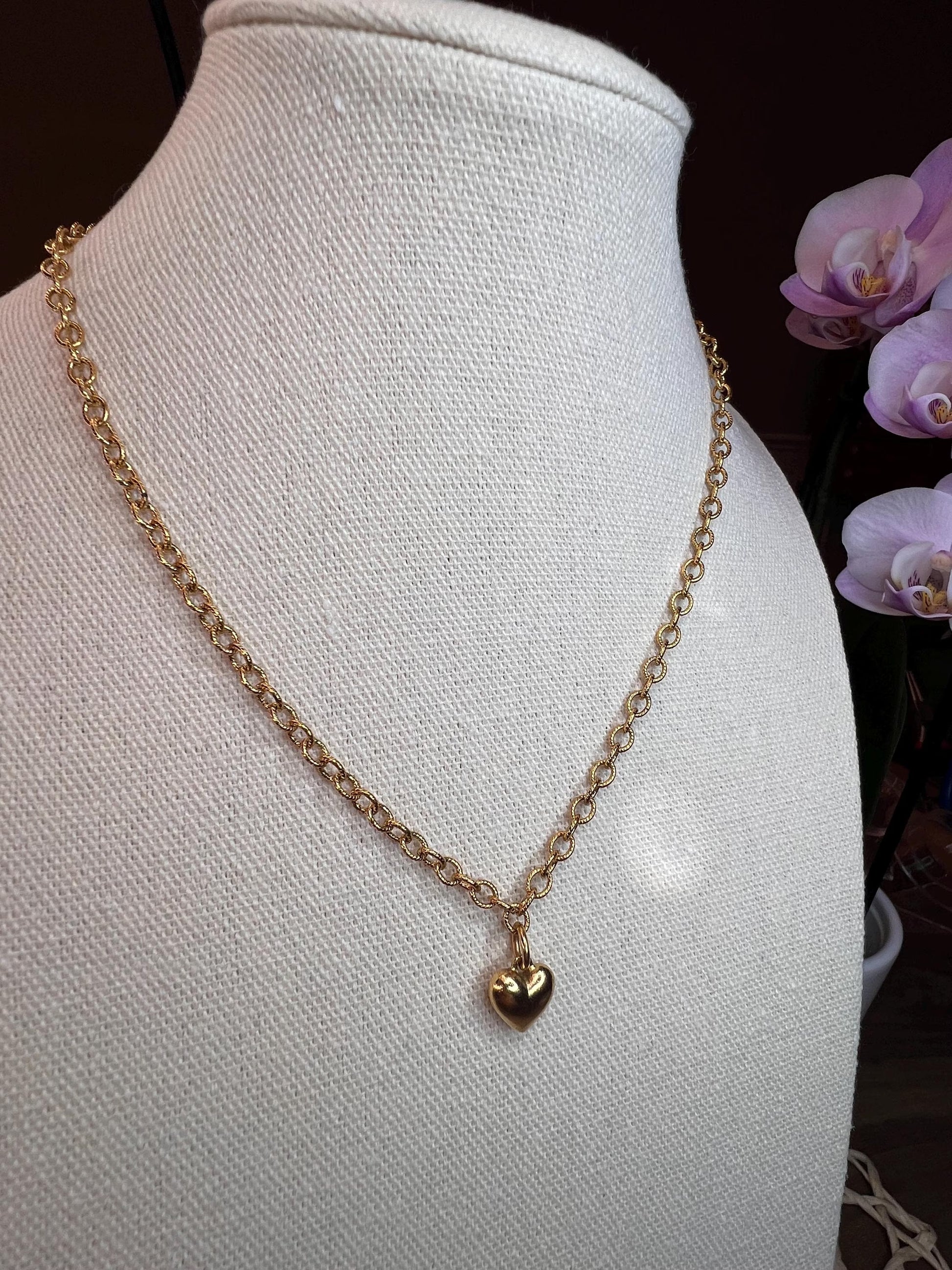 Puff Heart charm · Fine-textured cable chain · Antiqued 18k gold-plated finish · Adjustable 18” length · Solid, high-quality charm · Muted, vintage-inspired finish, minimum shine.