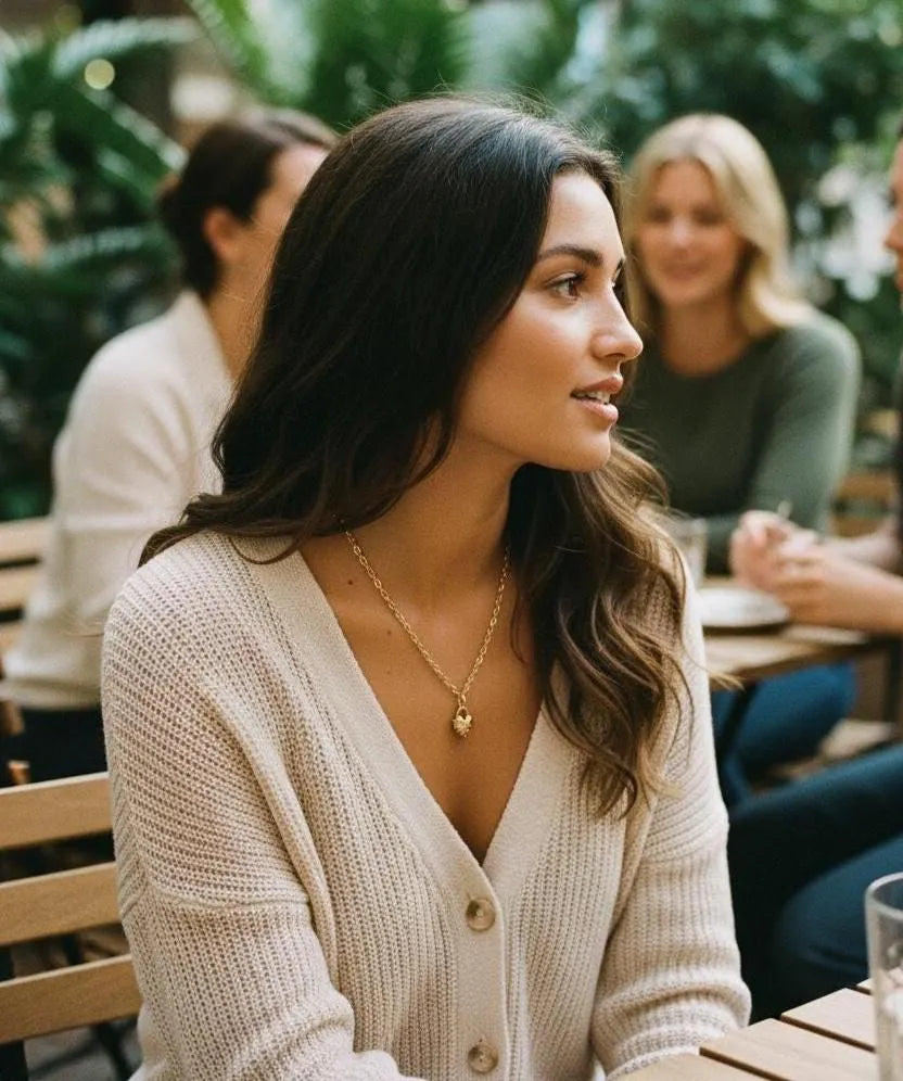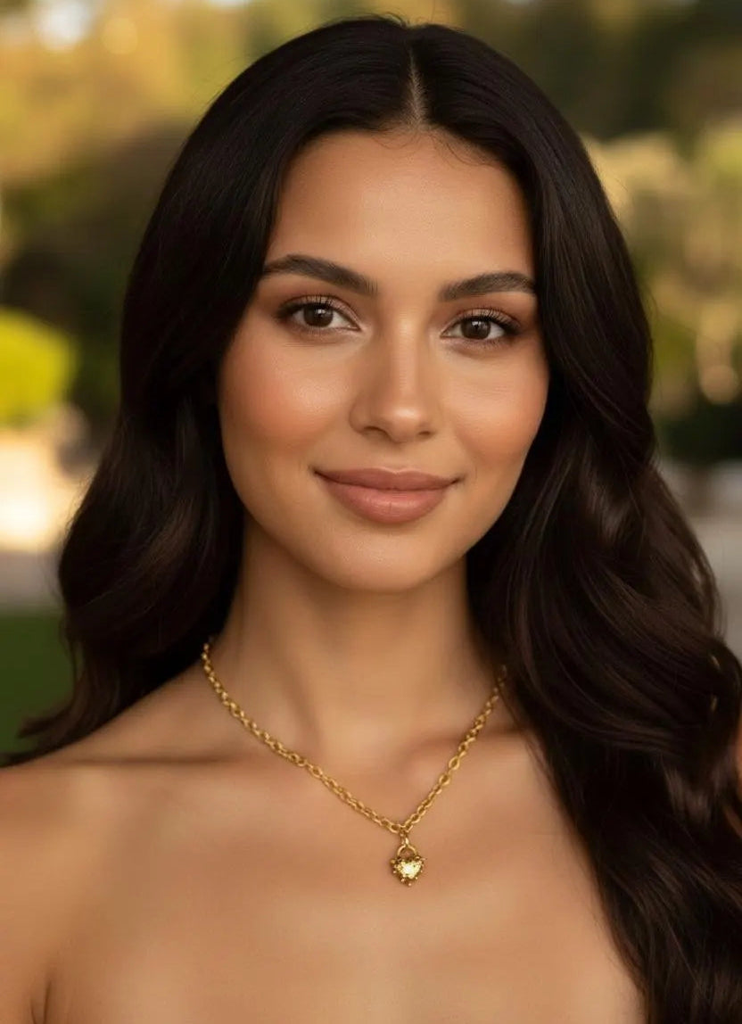 A sculptural Spike Heart charm paired with a fine-textured cable chain in antiqued 18k gold-plated finish. Designed to feel modern, intentional, and effortlessly wearable—perfect solo or layered with other necklaces.