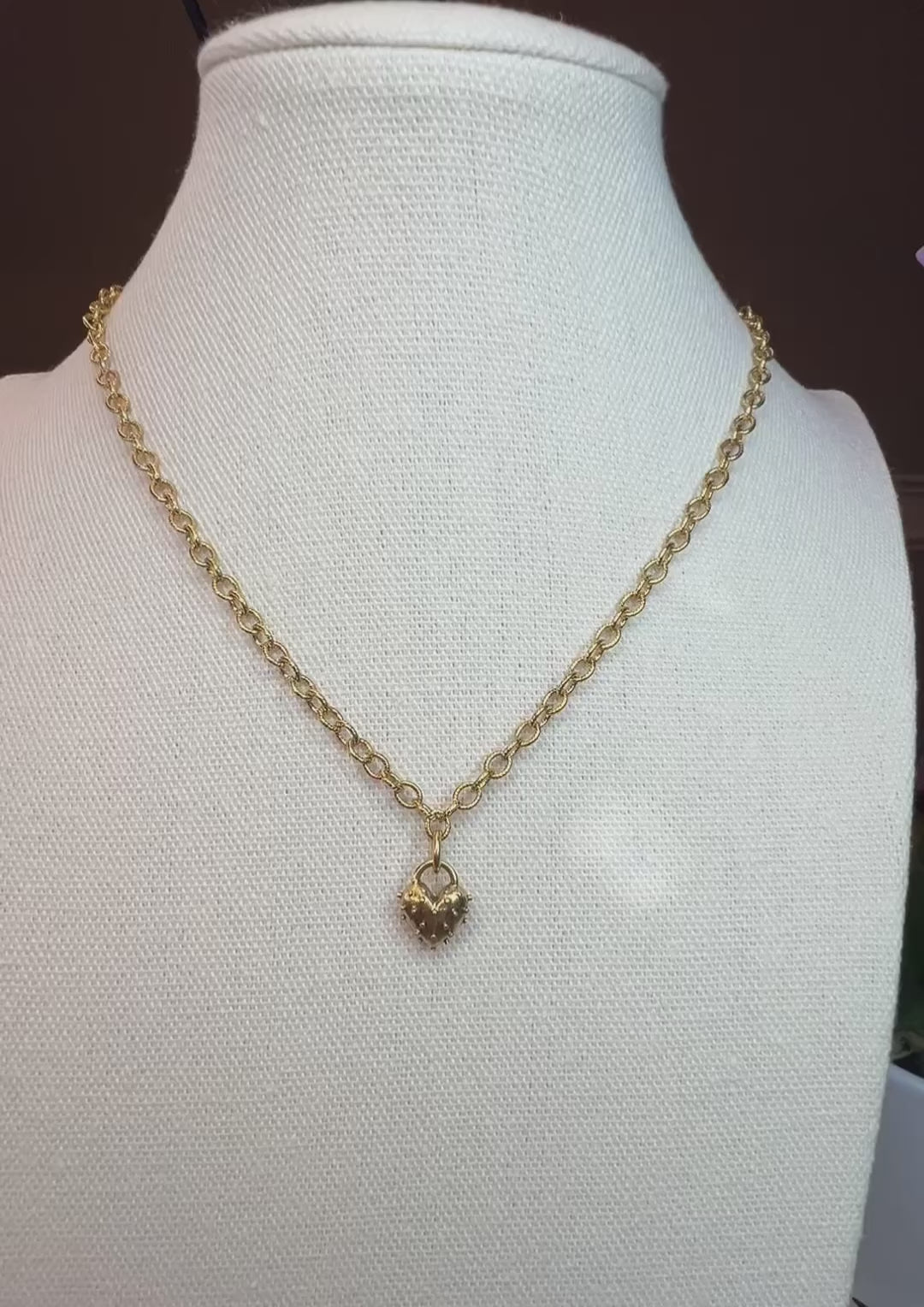 Spike Heart charm · Fine cable chain · Antiqued 18k gold-plated finish · Adjustable 18” length · Muted, vintage-inspired finish, minimum shine.