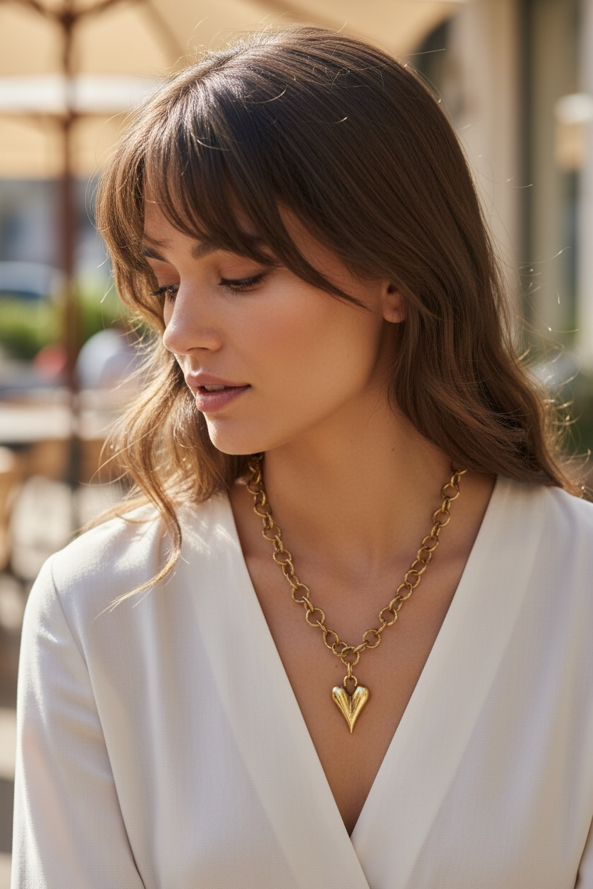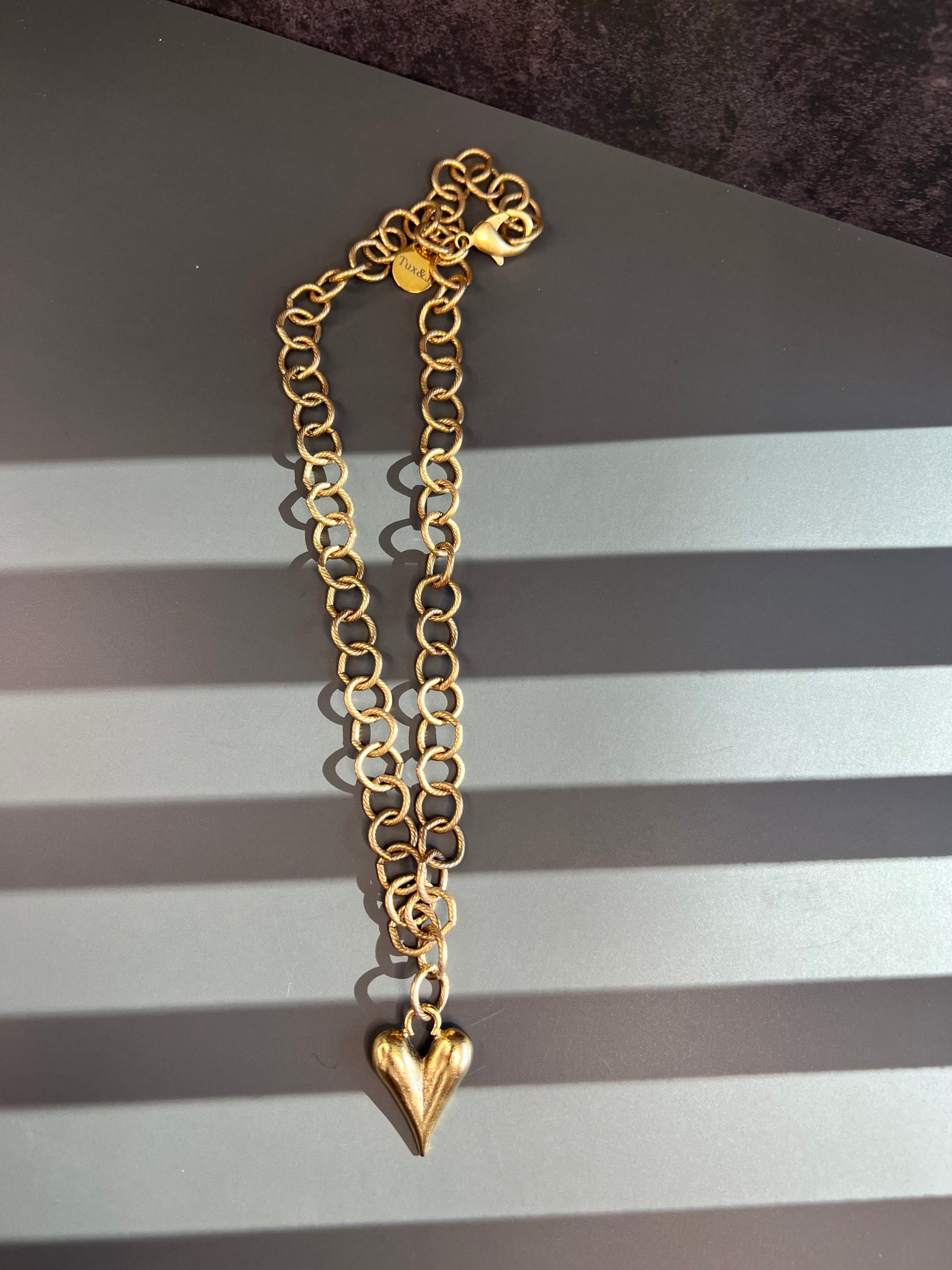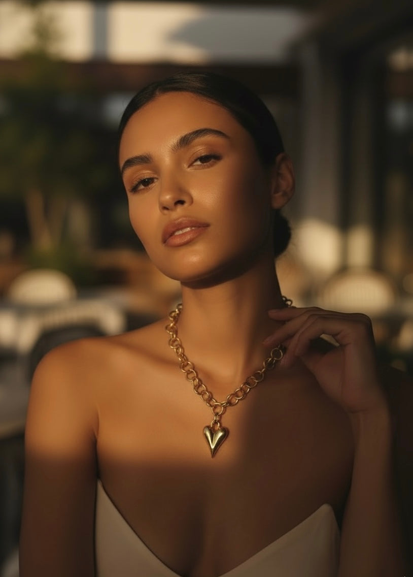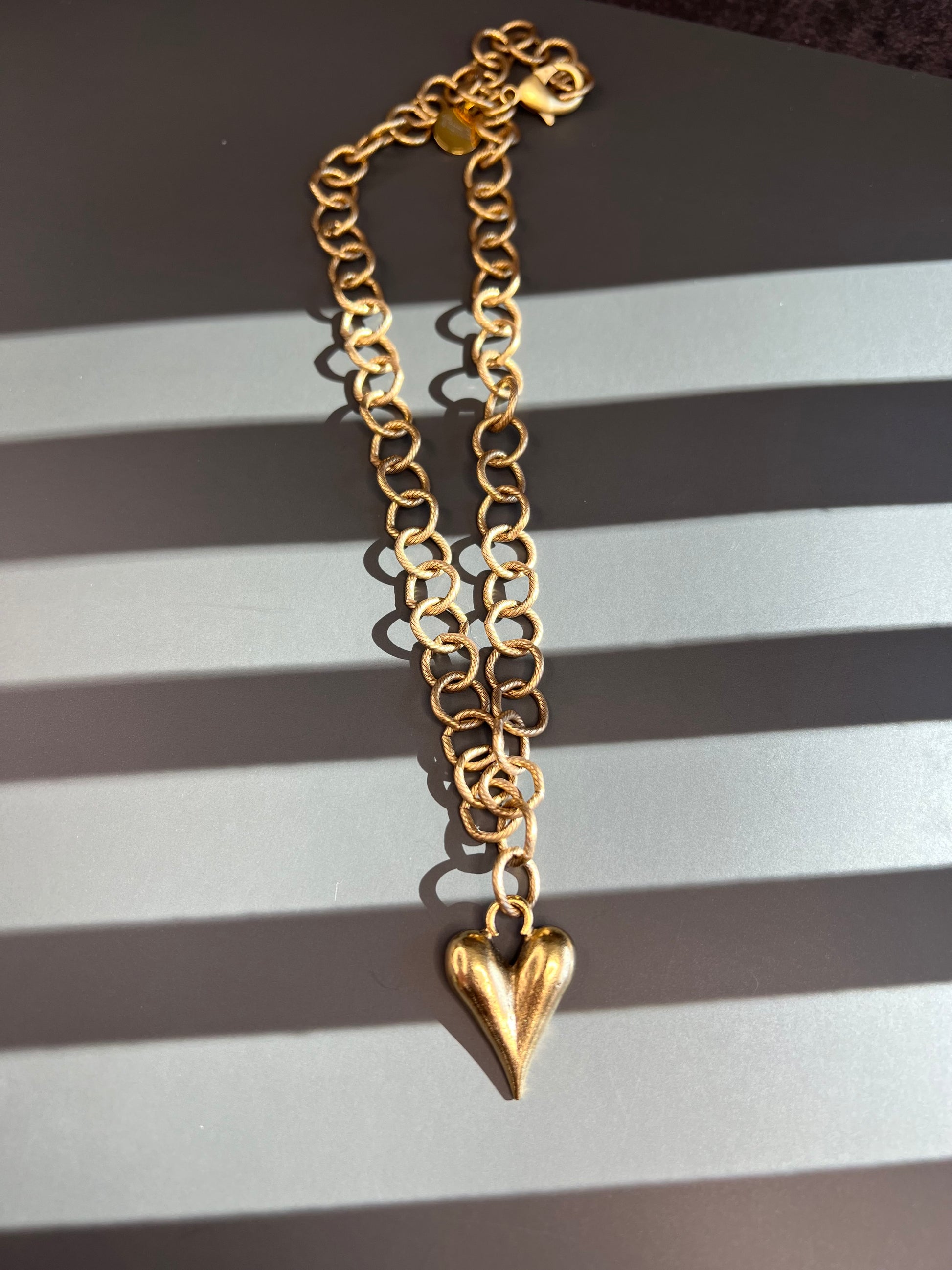 A bold Tesoro Heart charm paired with a large-scale cable chain, finished in antiqued 18k gold-plated tone for a muted, vintage-inspired look. Designed to stand on its own or anchor a layered statement.