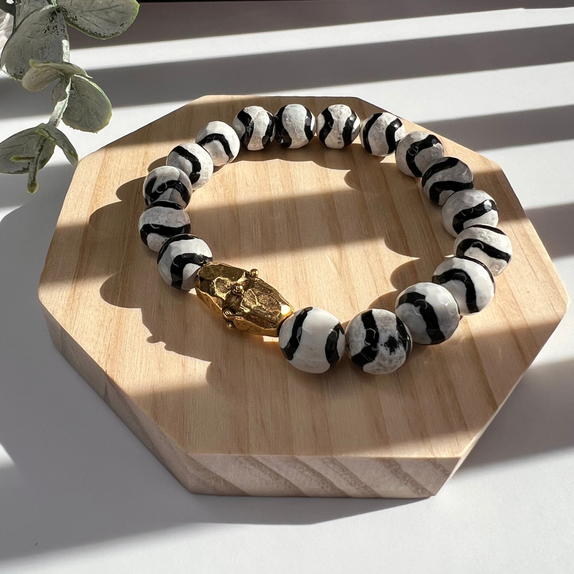 A grounding bracelet featuring natural Tibetan agate beads with an 18k antiqued gold accent. Designed for intention and effortless everyday wear.